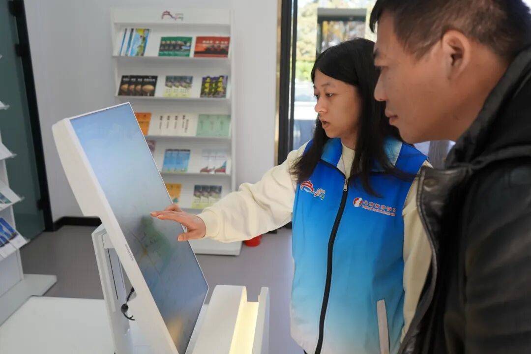 咨询员借助智慧旅游电子地图,为游客规划游览线路。