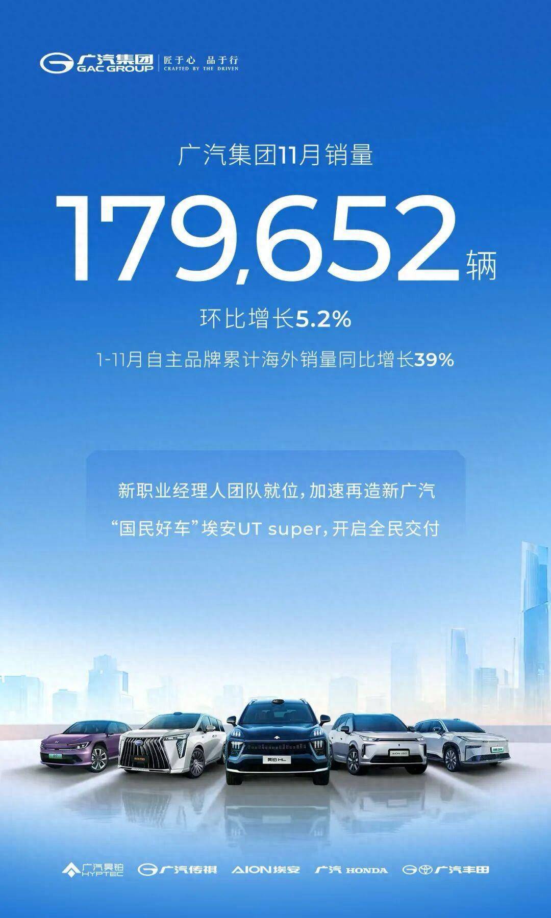 自主品牌中,广汽传祺前11月新能源车型销量突破15万辆,MPV家族累计销量超83万辆,其中E8系列连续16个月蝉联新能源中型MPV销量冠军;广汽埃安首款双动力车型i60上市两周订单破万,由京东、广汽集团与宁德时代联合打造的埃安UT super于11月启动规模化交付。
