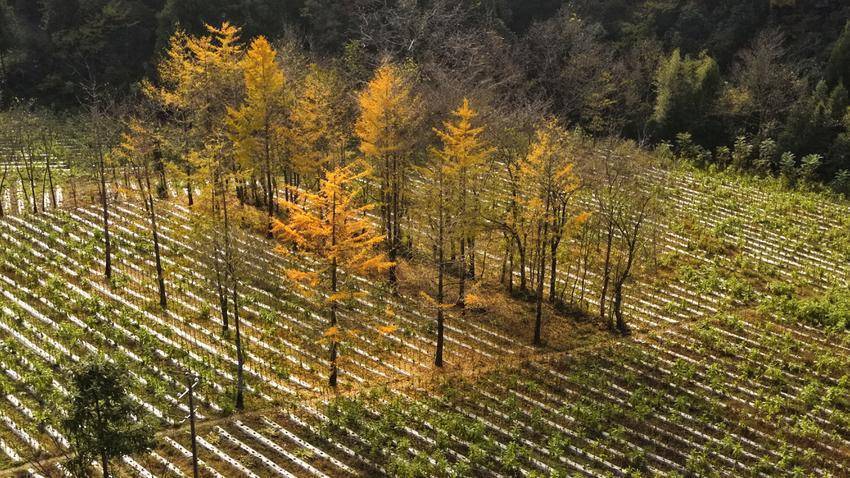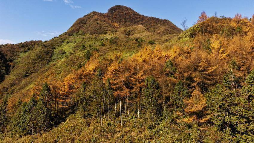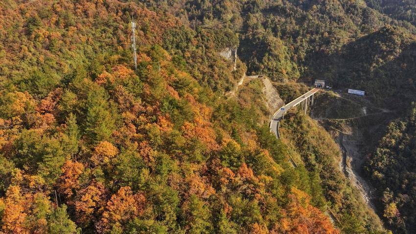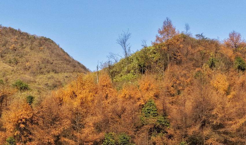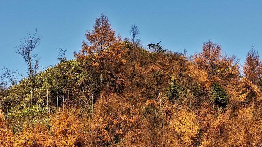 最动人的是那片“燃烧”的林麓:落羽杉抖落一身金箔,每片枝叶都盛着暖阳的温度,风过处,细碎的光斑在林间跳跃,像把整个秋天的余温都藏进了初冬的褶皱里。而盘山公路如银带般绕山,在彩林中蜿蜒出灵动的曲线,仿佛是自然写给人间的抒情诗行。